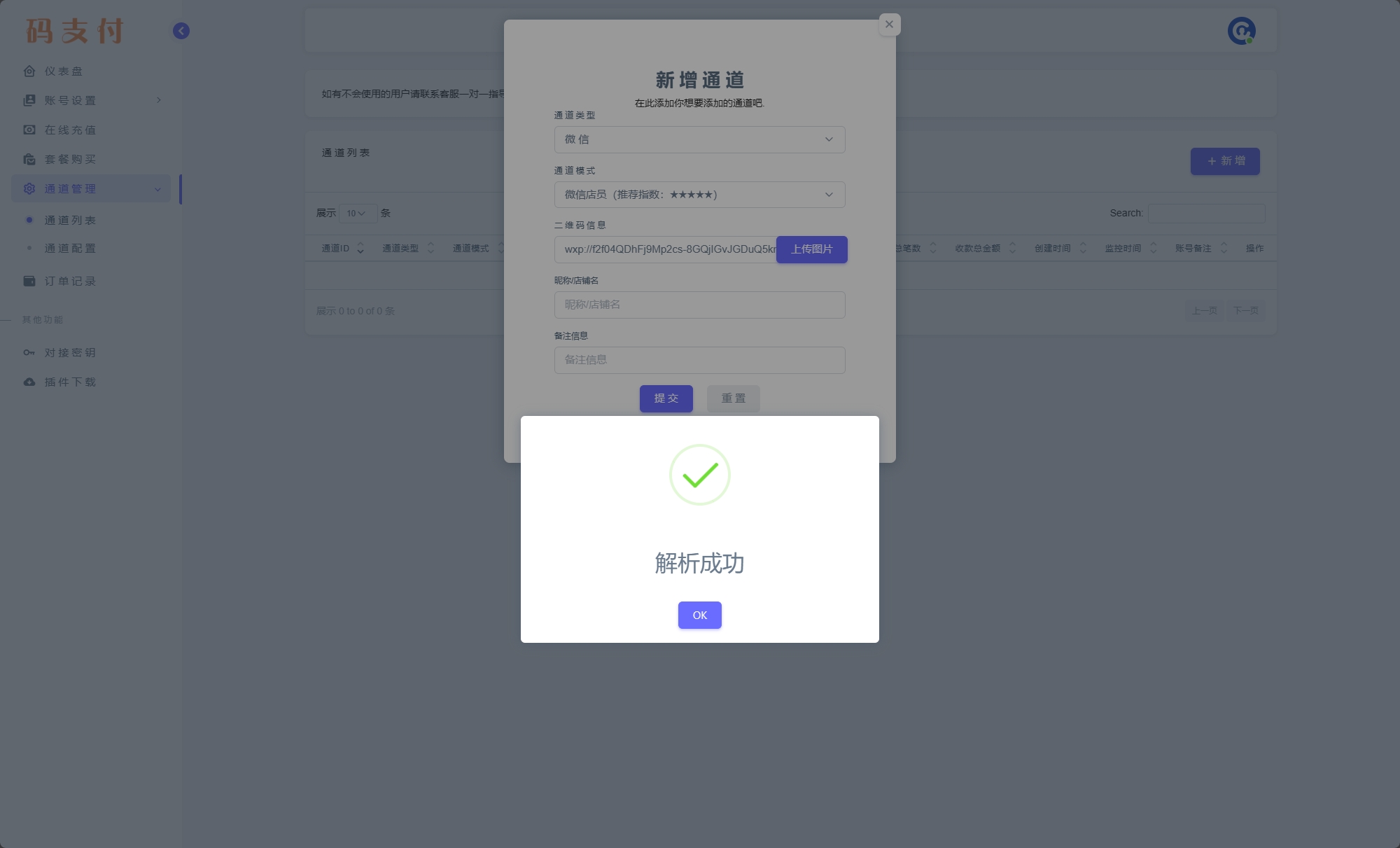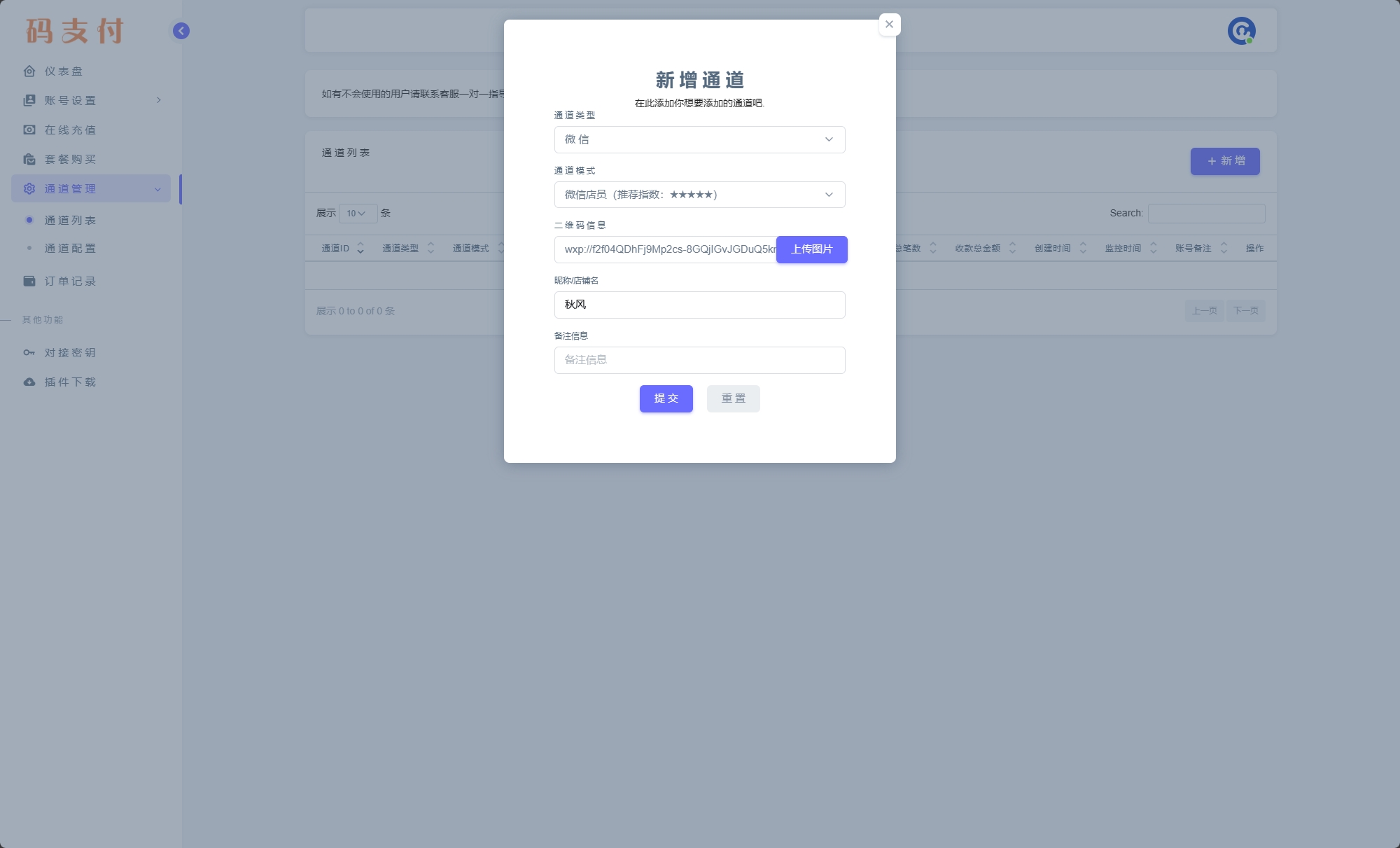 通道类型:“微信”,通道模式:“微信店员”上传我们刚才保存的二维码。