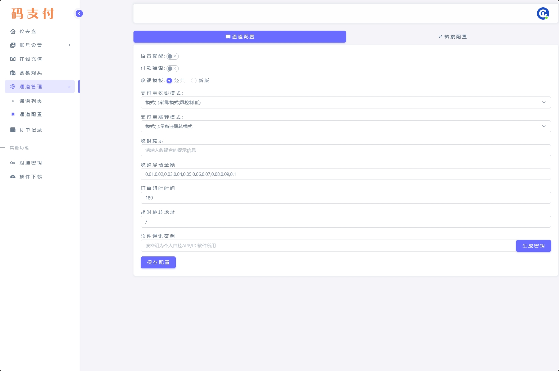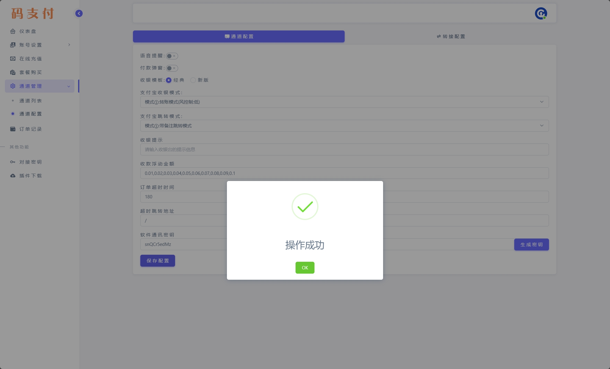 通讯密钥获取“通道管理”,“通道配置”,“生成密钥”