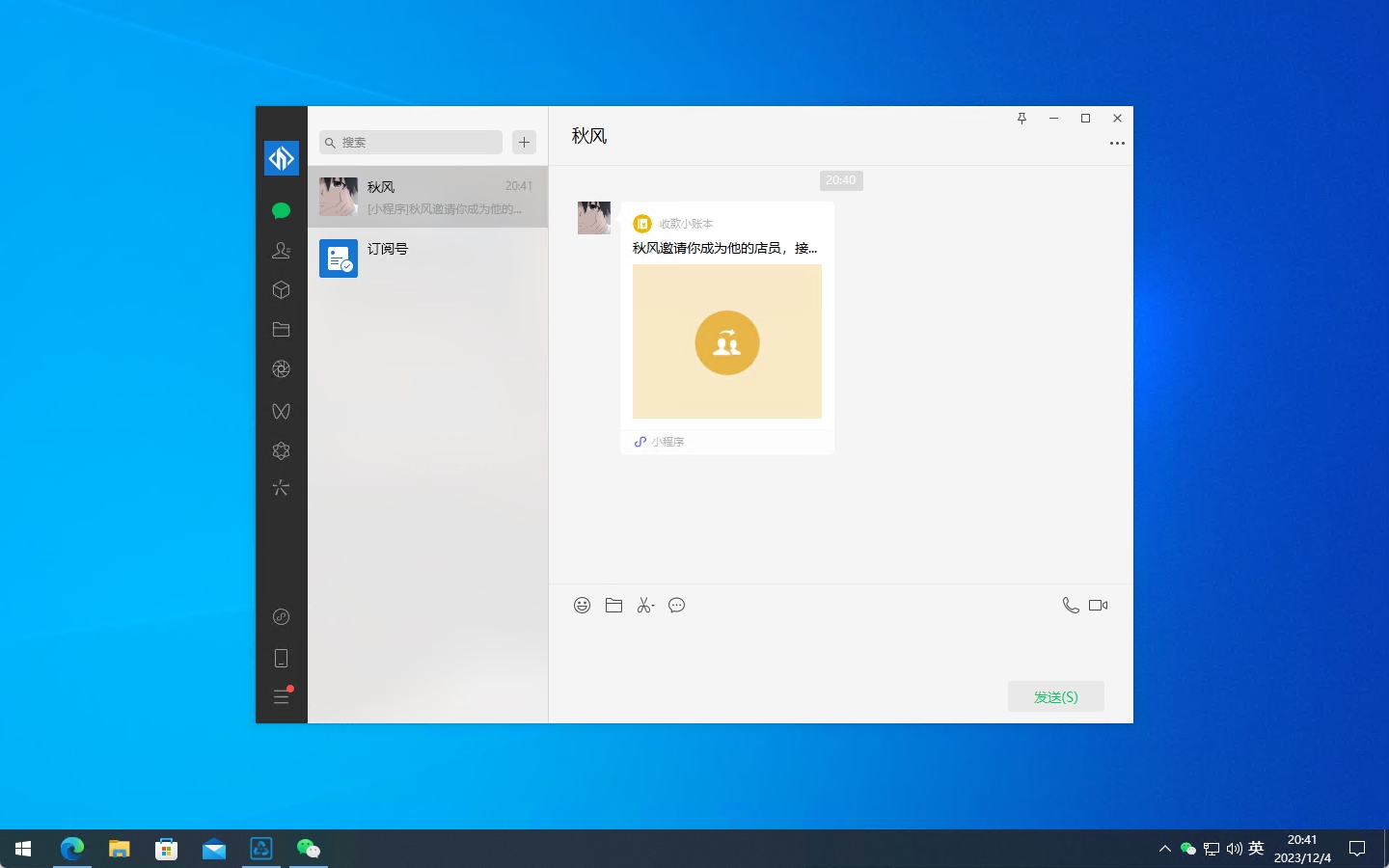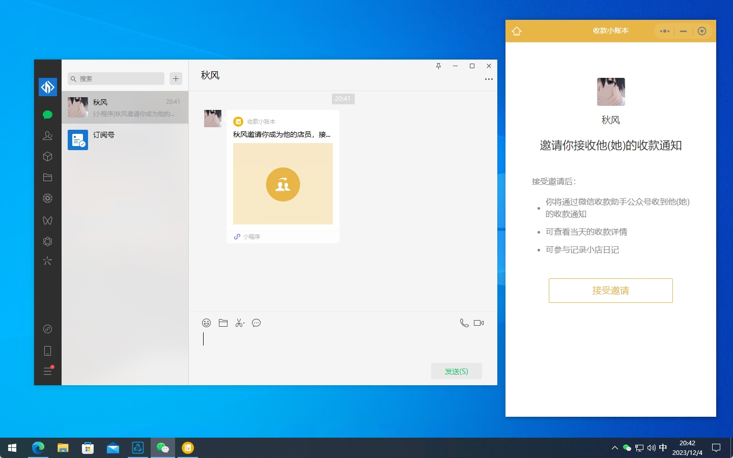 使用收款微信添加店员监控微信,并邀请成为店员。