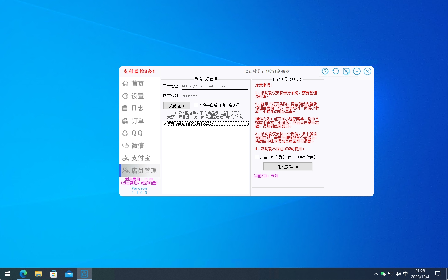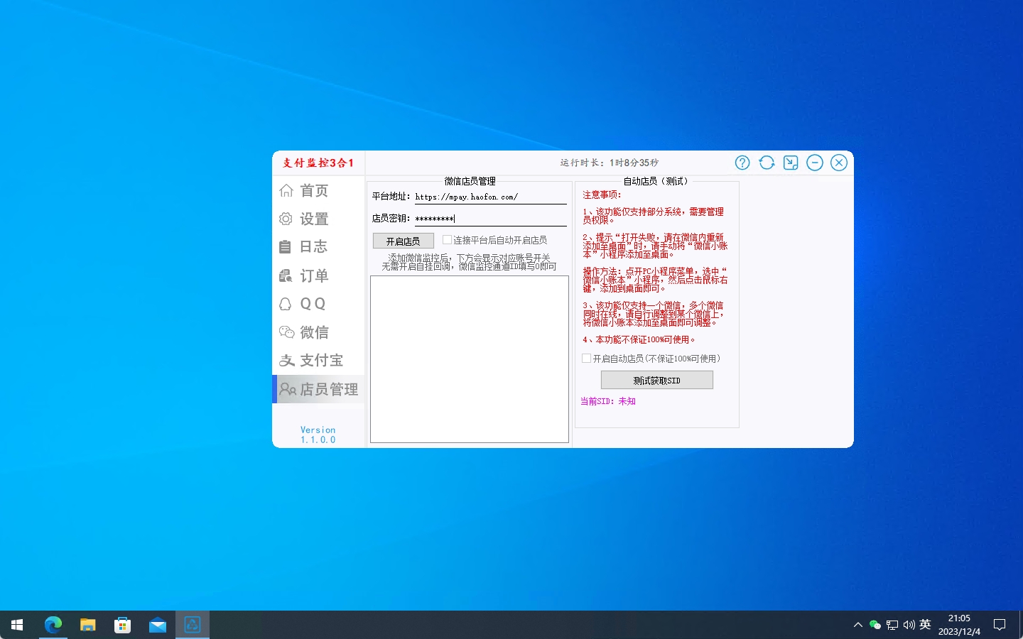 链接平台开启店员管理,店员密钥为:联系客服获取。